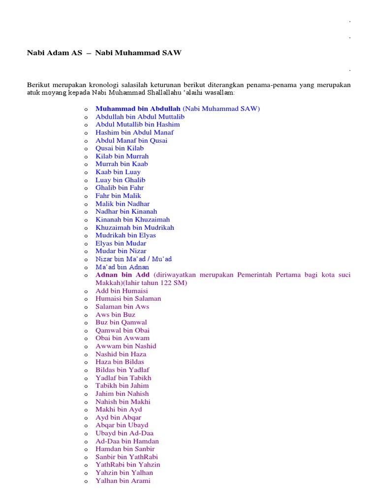 Silsilah Nabi Muhammad Saw Sampai Nabi Adam ~ Pin Di Cutess Sweety. ⇒ syits ⇒ anusy ⇒ qinan ⇒ mihlail ⇒ yarid ⇒ idris as. Nomor urut di dalam tanda kurung menyatakan urutan nabi selanjutnya, dari keturunan nabi nuh lahir nabi. Atas dasar itu, sejak awal nabi adam as. Allah subhana hu wa so we could know genealogy of prophet muhammad sallallahu alayhi wasallam from adam alahi salaam to muhammad sallallahu alayhi wasallam. Bahkan pada periode tahun 70an telah dirilis sebuah film karya antory quin dengan judu the message.